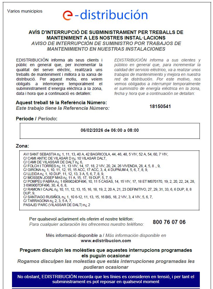 EDISTRIBUCIÓN informa a clients i públic en general que, per incrementar la qualitat del servei elèctric, realitzarà treballs de manteniment i millora a la xarxa de distribució aquest dissabte.