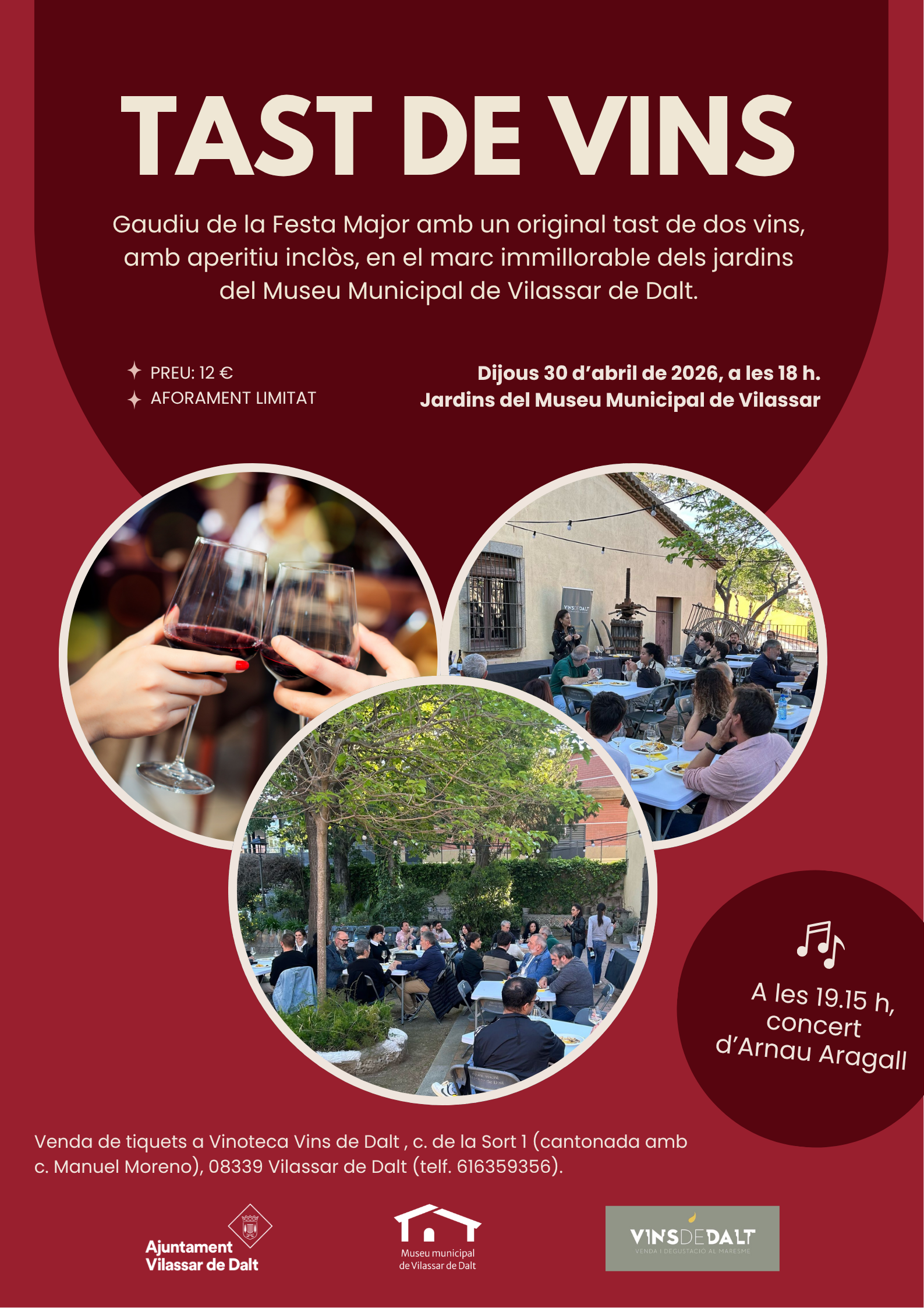 Els tiquets es poden adquirir a la vinoteca Vins de Dalt, c. de la Sort, 1 (cantonada amb c. Manuel Moreno), Vilassar de Dalt (tel. 616 359 356).